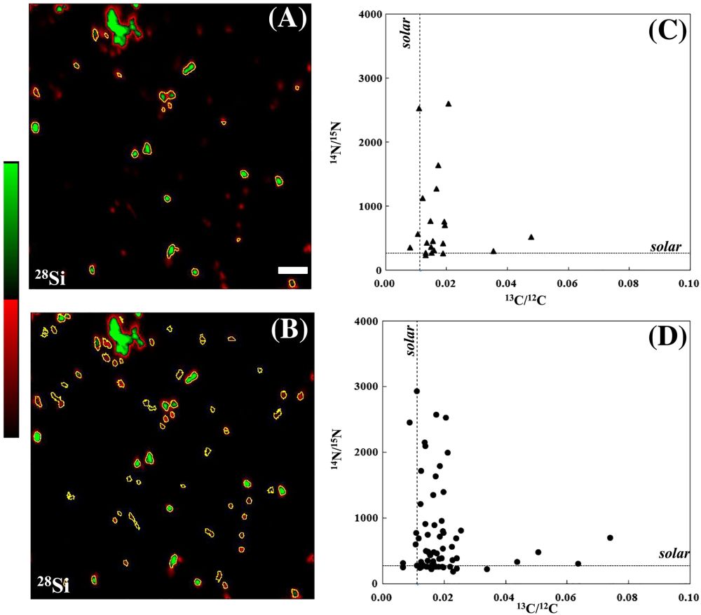 准确识别样品中微小颗粒并进行元素和同位素分析是复杂基体样品分析的难点。项目组以碳化硅、氮化硅的亚微米级颗粒的原位分析为例,采用基于 Otsu算法的局部动态阈值算法提高离子图像中的颗粒识别效率。