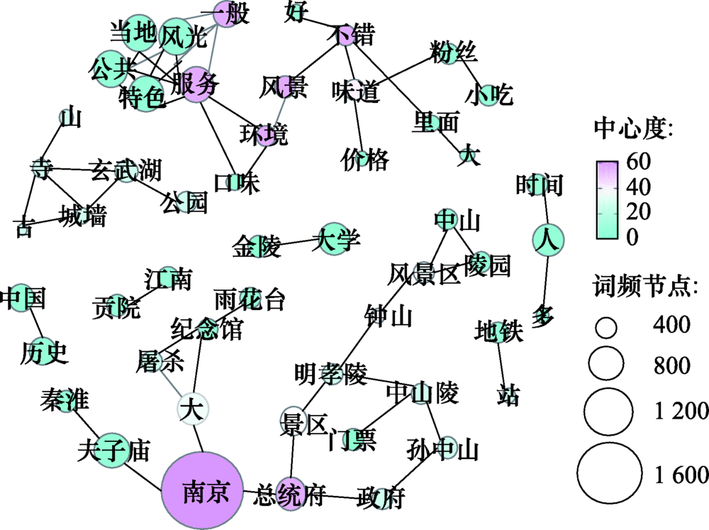 游客评论可以真实地反映南京的整体形象,词频共现网络图能够对数量庞大的评论数据进行关键信息的提取、关联分析和可视化处理,因此本文通过绘制游客评论的共现网络图(图4)对南京的整体形象进行分析。